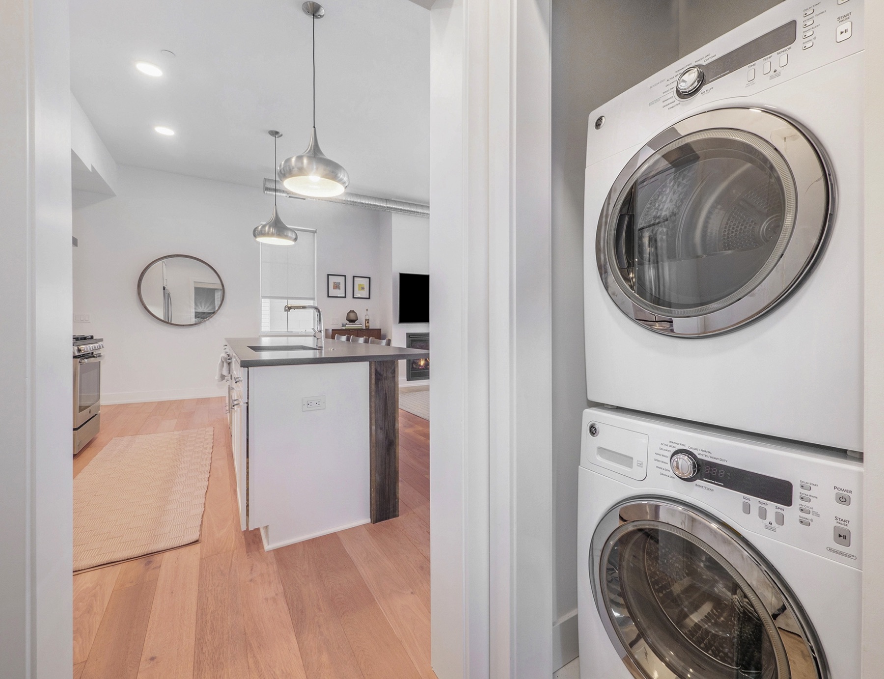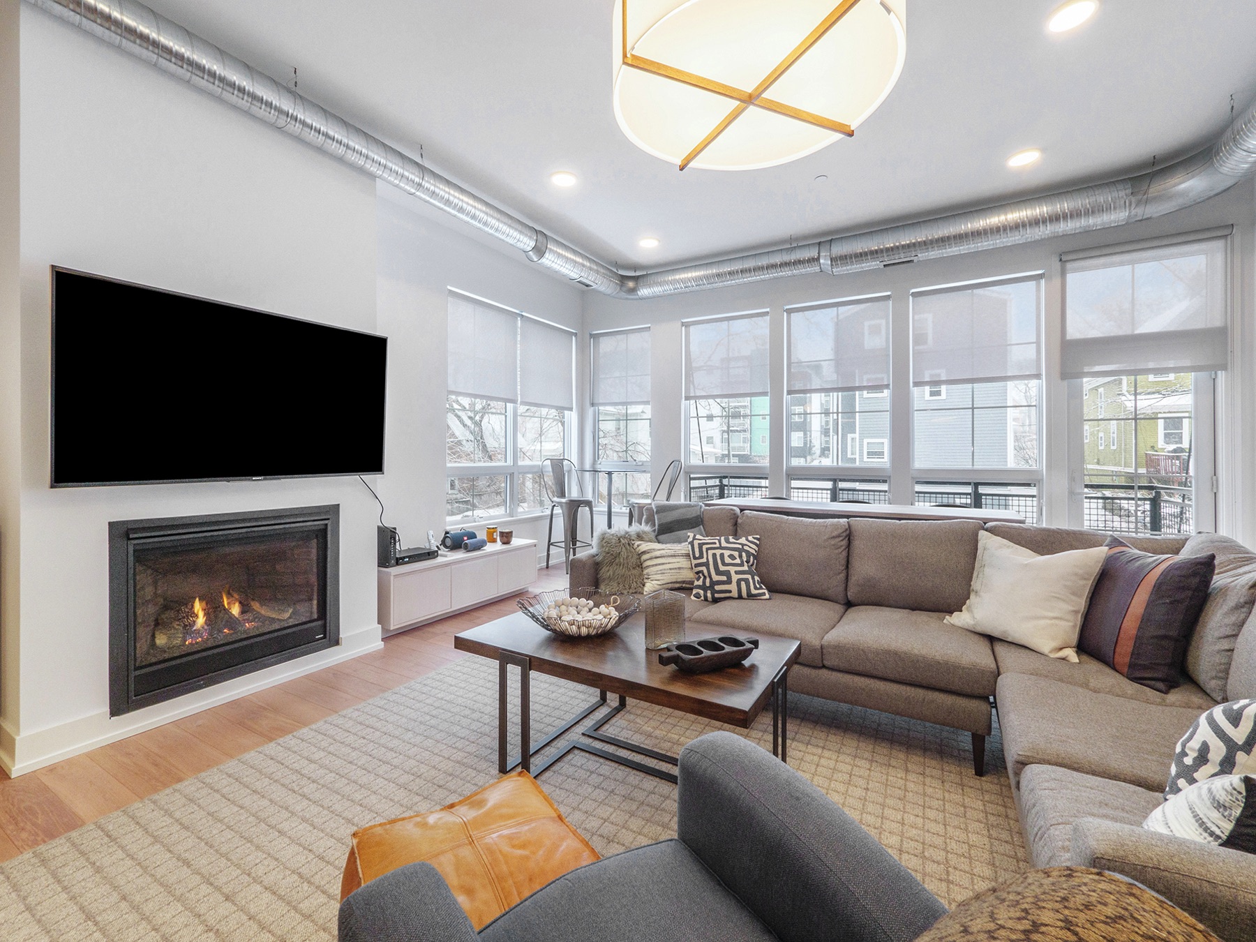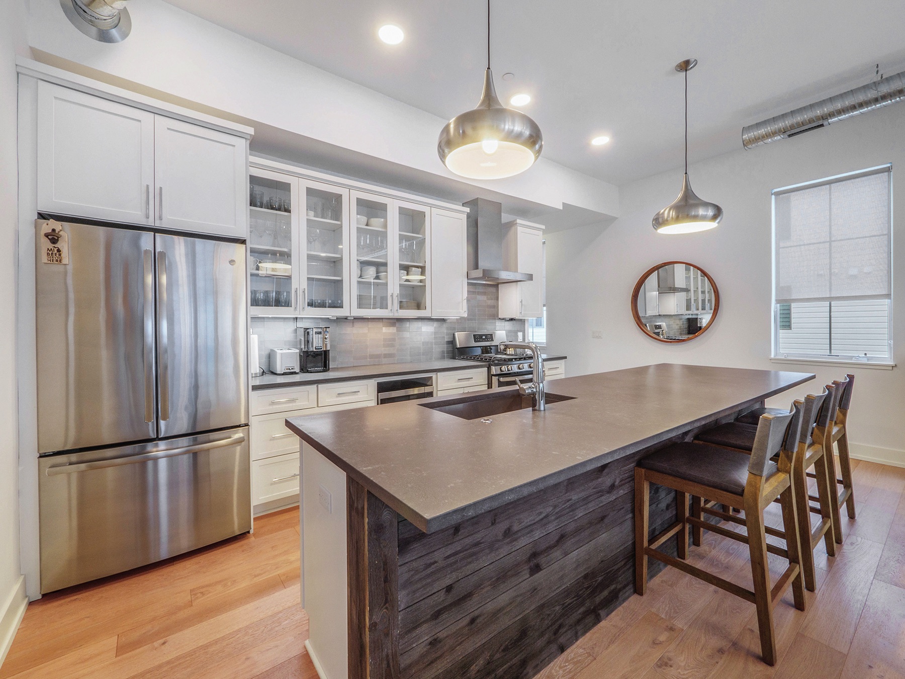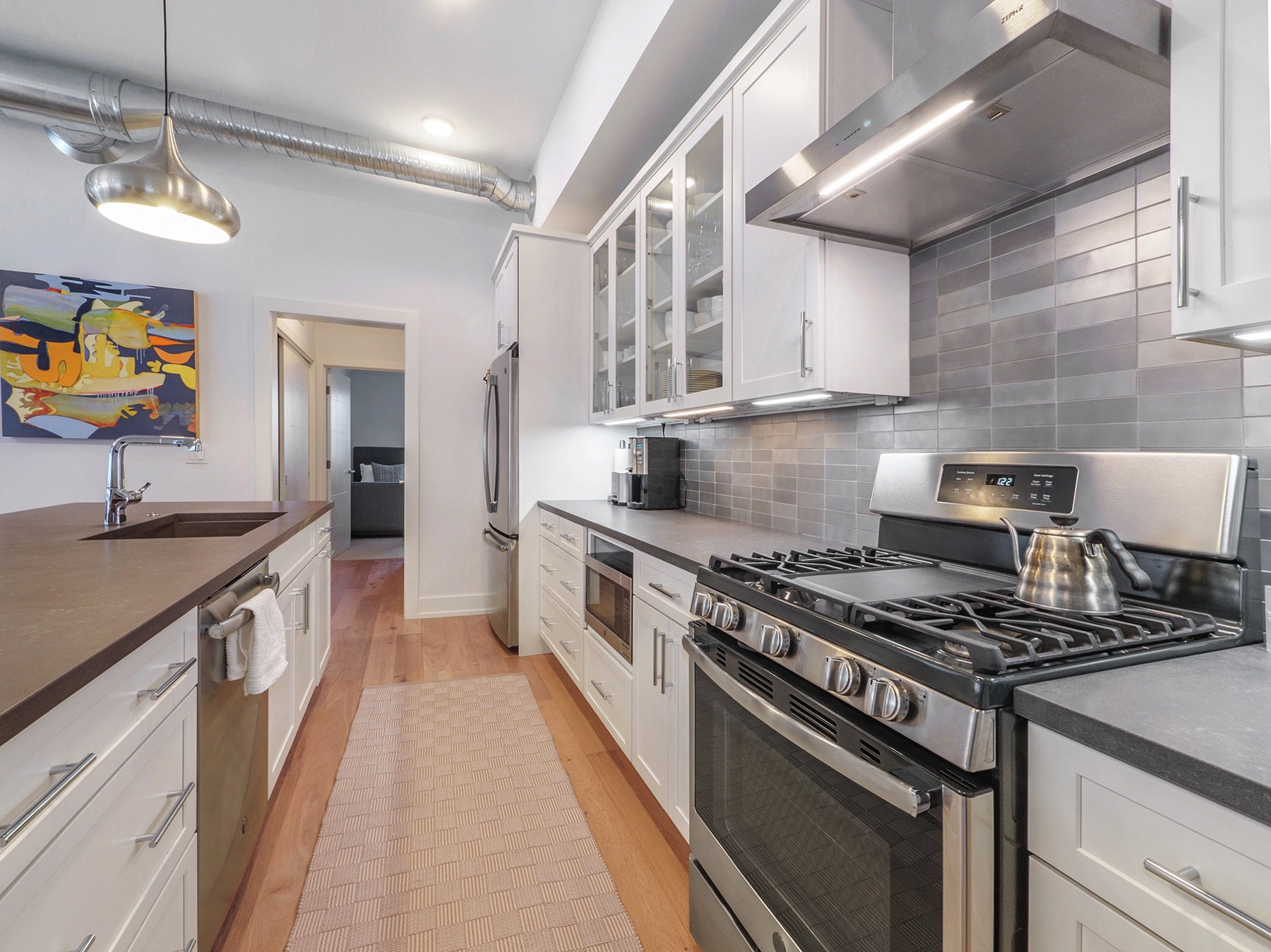 Chic 2.5 bedroom 2 full bath downtown, Kerrytown district condominium, in a project of 24 total units, 4 years new.  You will find an extraordinarily swanky and efficient chef’s kitchen with white maple cabinetry, many with mullion upper doors. There are top of the line stainless steel appliances including a convection gas oven, enormous French door refrigerator, and sharp stainless range hood. The countertops are a dynamite metro slate, and the kitchen backsplash is satin metal.  This unit is a ‘soft loft’ meaning the galvanized ductwork is exposed throughout.  A cozy gas fireplace and breathtaking living room fixture are welcoming, in this sleek condo, with hickory flooring throughout the common living space. The amazing light filled master suite has a large walk in closet, terrific modern light fixture, and gobs of windows.  There are custom window treatments throughout, including roller shades and draperies.  The master bath features a roomy linen closet , euroglass shower installation and quartz countertops. The current owner is using the study as a third bedroom and the second full bath is first class. There is a stackable washer and dryer conveniently located off the kitchen and is included in the mechanical room. This unit has a 15 X 4 outdoor terrace perfect for morning coffee.  The condo comes with two garaged parking spots and a secure key fob guest entry system.  Walk to Kerrytown, Zingermans, Farmer’s Market and downtown Ann Arbor from here. Minutes to M-14, U of M Medical Complex and Central Campus.  This place is stunning!