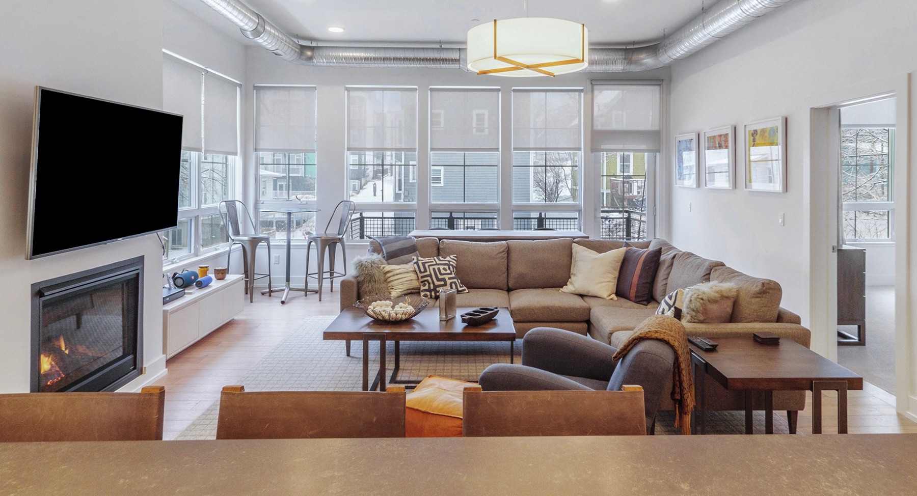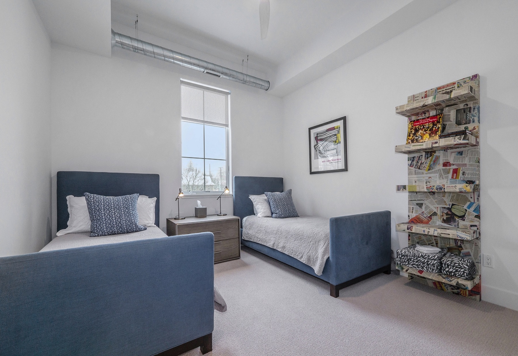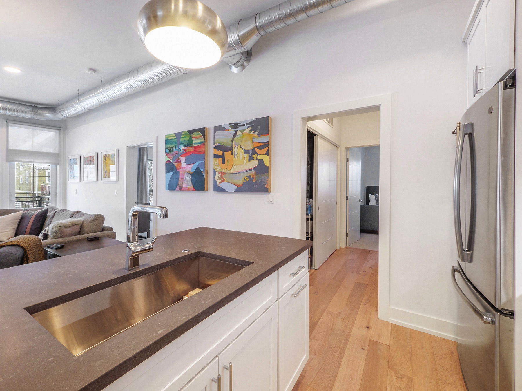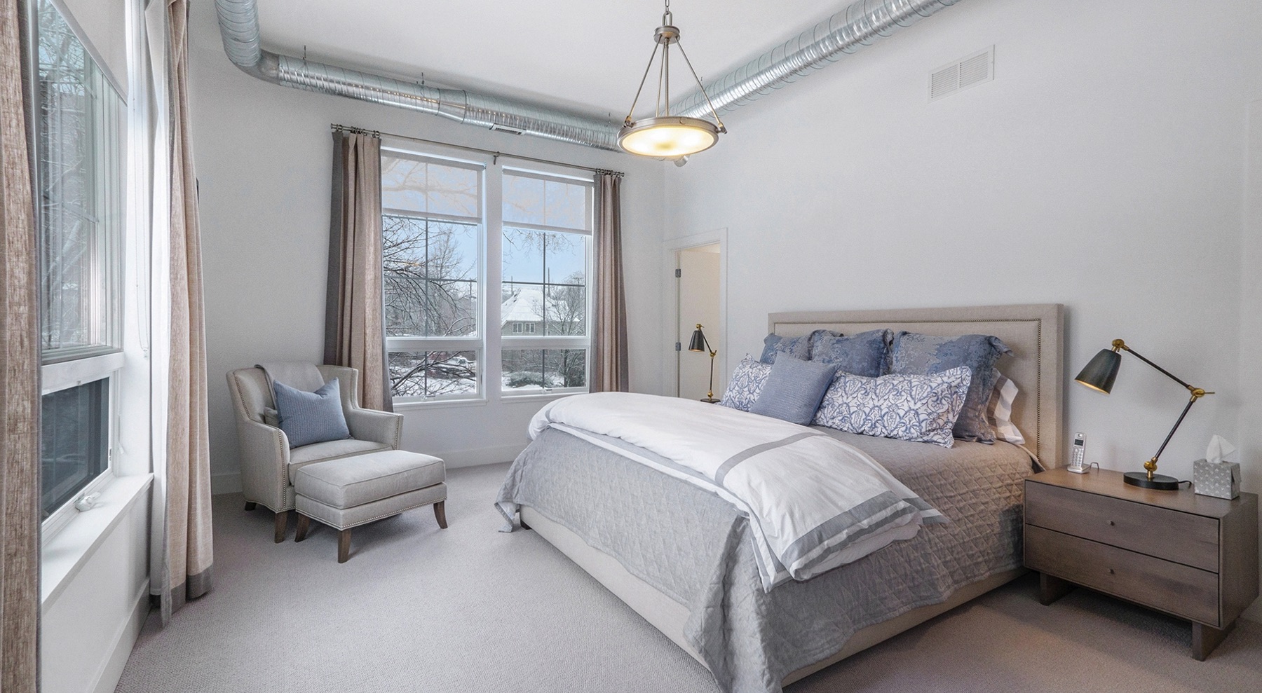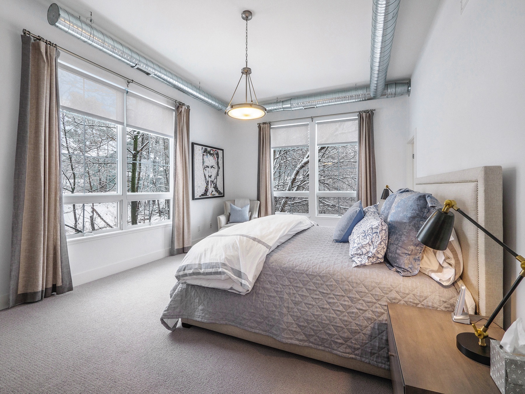 Chic 2.5 bedroom 2 full bath downtown, Kerrytown district condominium, in a project of 24 total units, 4 years new.  You will find an extraordinarily swanky and efficient chef’s kitchen with white maple cabinetry, many with mullion upper doors. There are top of the line stainless steel appliances including a convection gas oven, enormous French door refrigerator, and sharp stainless range hood. The countertops are a dynamite metro slate, and the kitchen backsplash is satin metal.  This unit is a ‘soft loft’ meaning the galvanized ductwork is exposed throughout.  A cozy gas fireplace and breathtaking living room fixture are welcoming, in this sleek condo, with hickory flooring throughout the common living space. The amazing light filled master suite has a large walk in closet, terrific modern light fixture, and gobs of windows.  There are custom window treatments throughout, including roller shades and draperies.  The master bath features a roomy linen closet , euroglass shower installation and quartz countertops. The current owner is using the study as a third bedroom and the second full bath is first class. There is a stackable washer and dryer conveniently located off the kitchen and is included in the mechanical room. This unit has a 15 X 4 outdoor terrace perfect for morning coffee.  The condo comes with two garaged parking spots and a secure key fob guest entry system.  Walk to Kerrytown, Zingermans, Farmer’s Market and downtown Ann Arbor from here. Minutes to M-14, U of M Medical Complex and Central Campus.  This place is stunning!